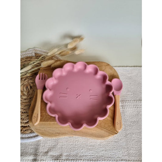 Siliconen set bordje leeuw + vork en lepel Poederroze - Rammelaartje