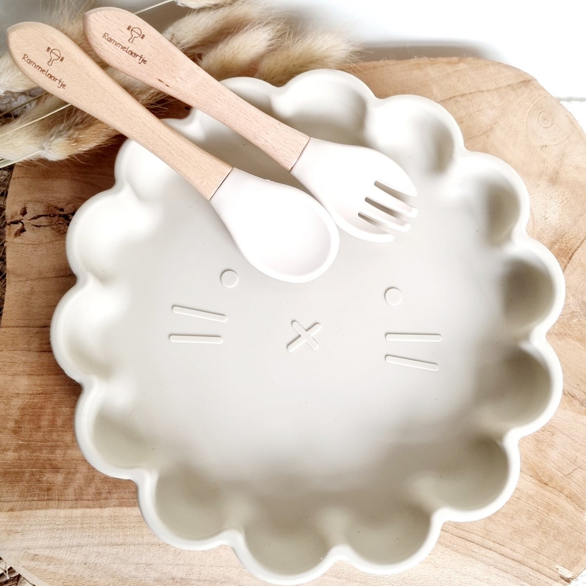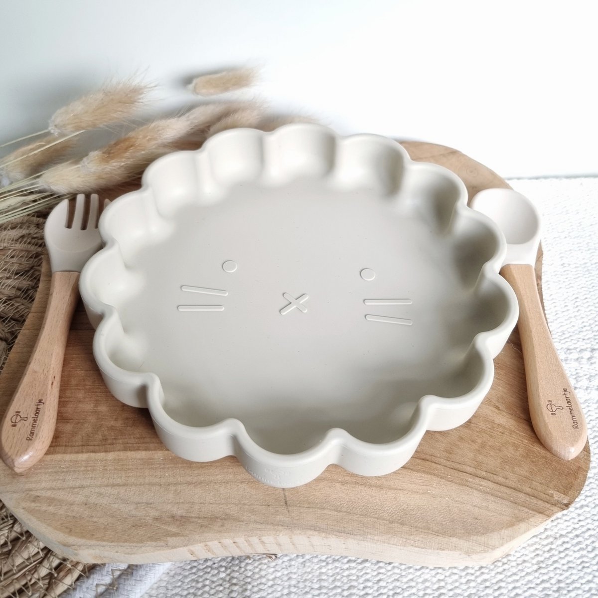 Siliconen set bordje Leeuw + vork en lepel Beige - Rammelaartje